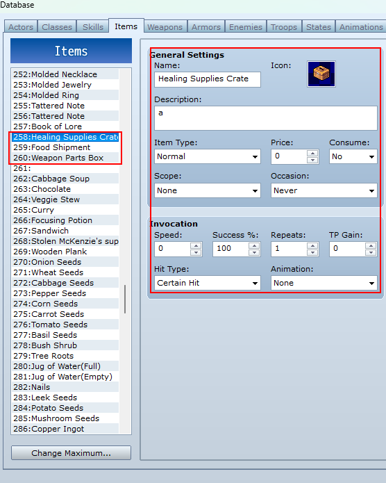 - Make Items to deliver (This case it's items with ID 258, 259, 260
